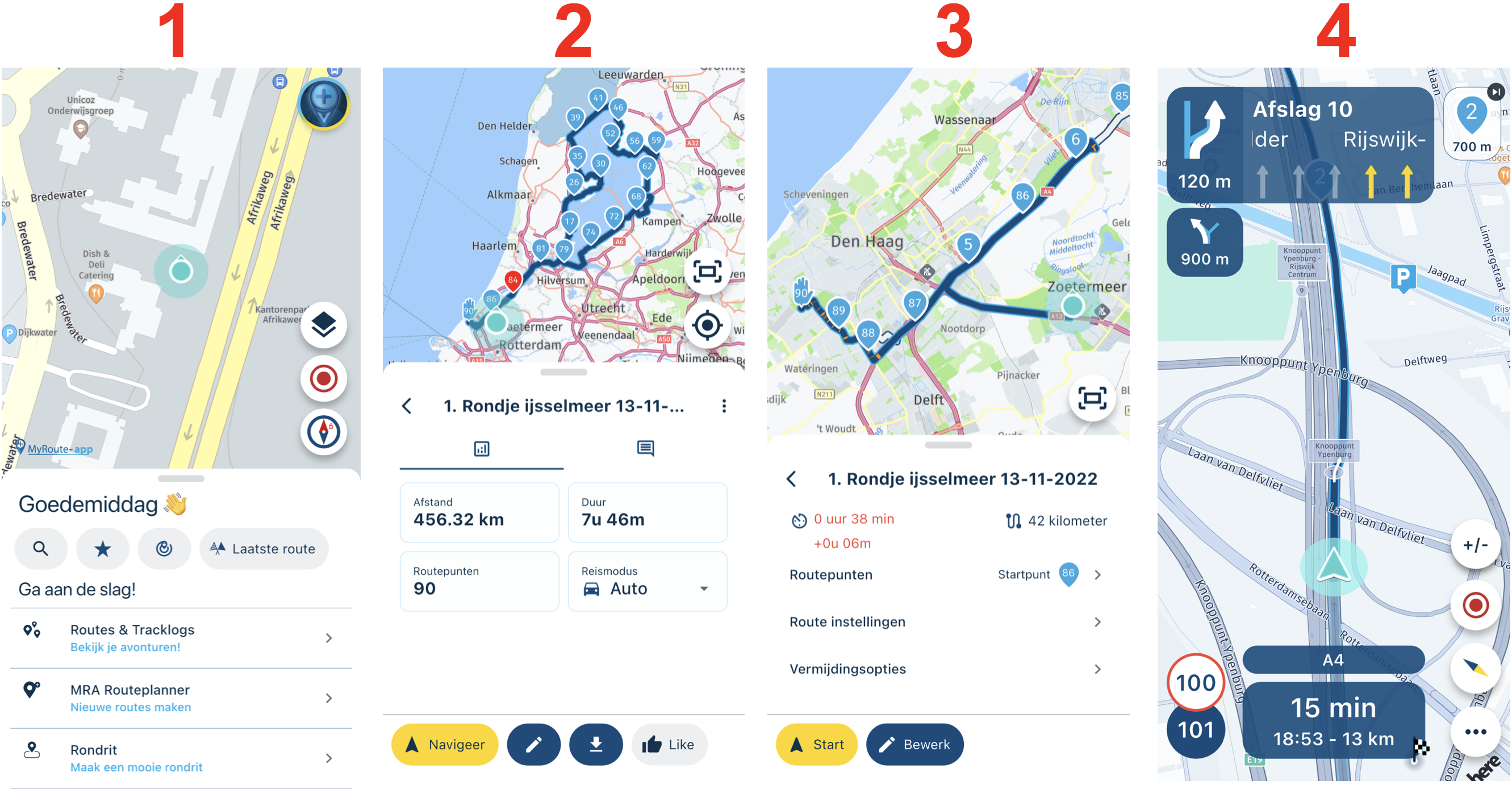 Zie hier welke schermen je tegenkomt wanneer je in de app een route opstart voor de navigatie. In de handleiding zal soms worden terugverwezen naar deze schermen.