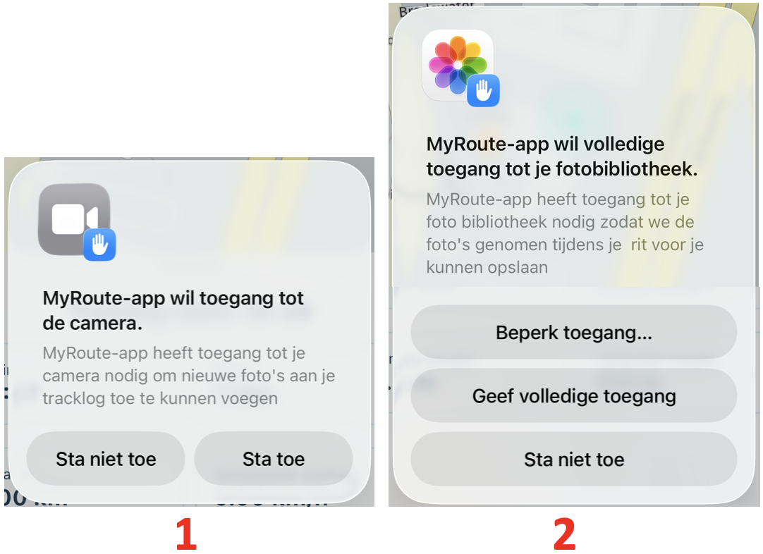 Bij het maken en toevoegen van foto's aan je tracklog, krijg je bij het eerste gebruik twee meldingen waar je om toestemming wordt gevraagd: