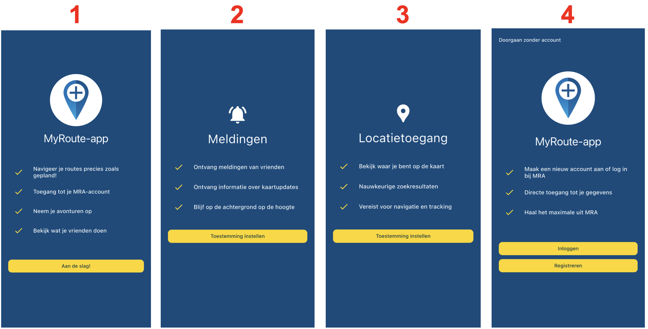 - Begin: Kies hier of je de app wilt gebruiken zonder account of kies ervoor om je bij MRA te registreren of in te loggen met je bestaande account.