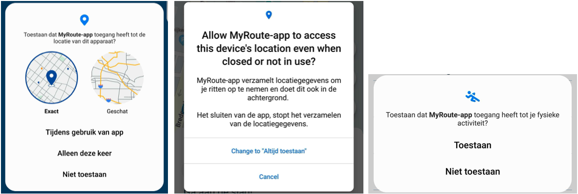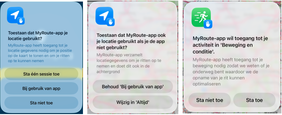 - Locatietoegang: Geef hier toestemming tot je locatie. Wij raden aan om hier voor 'Bij gebruik van app' te kiezen. Lees later in deze handleiding meer over de locatietoestemmingen;