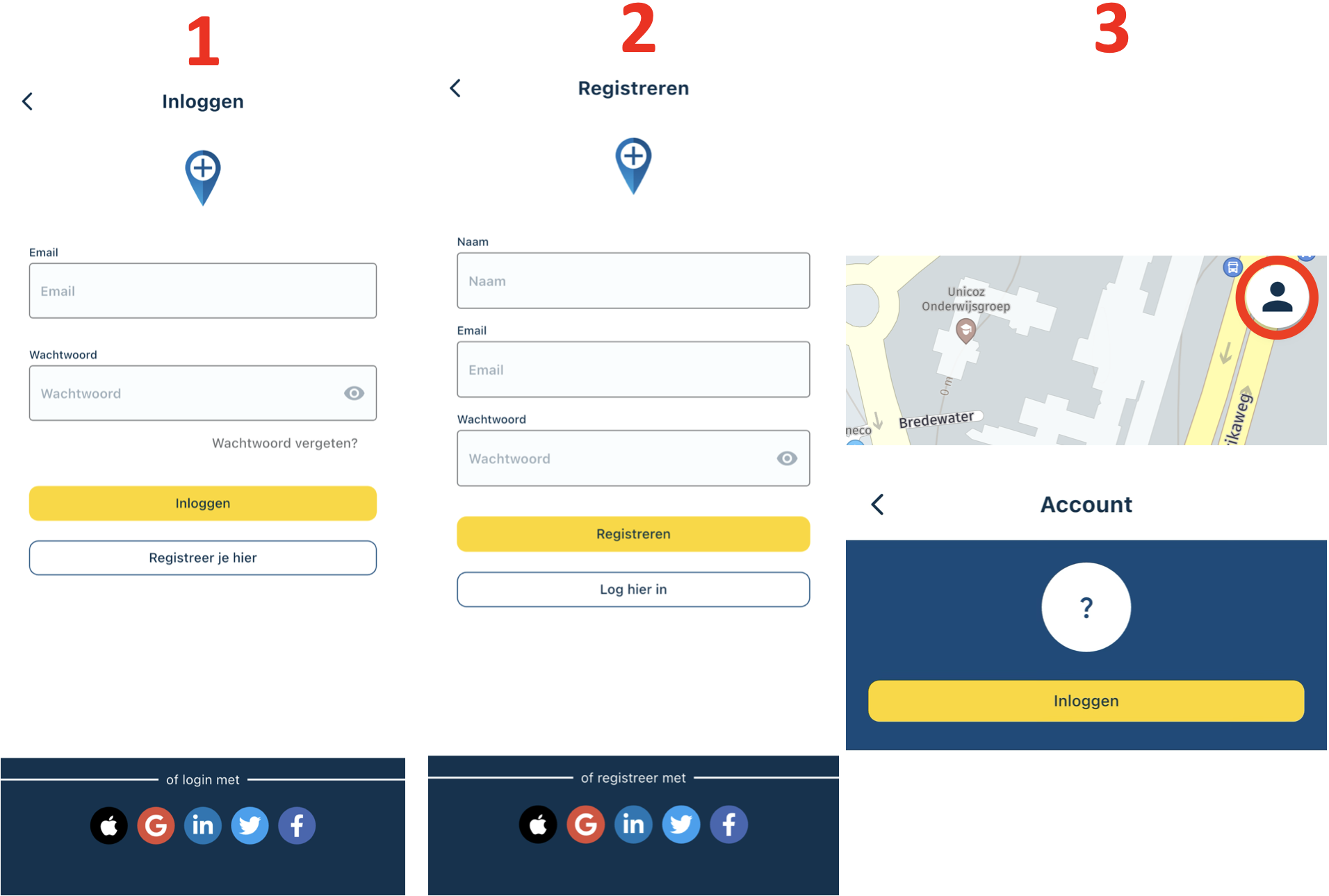 Je kan vanuit het startscherm gelijk inloggen of een account aanmaken. Als je de app al hebt, zie je op scherm 3 hoe je kan inloggen.